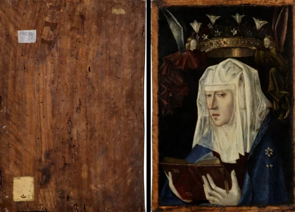 It seems that this hidden layer remained in a sketch-like state until the panel was repurposed for the final depiction of ”The Virgin Reading”. The similarity in intensity and style between this preliminary sketch and the final painting suggests that they are both works of the same artist. The artist is conjectured to be a Valencian painter active around 1470, given the particular interests in perspective demonstrated in the underlying depiction of Saint Michael, notably his perspective-adjusted halo.
