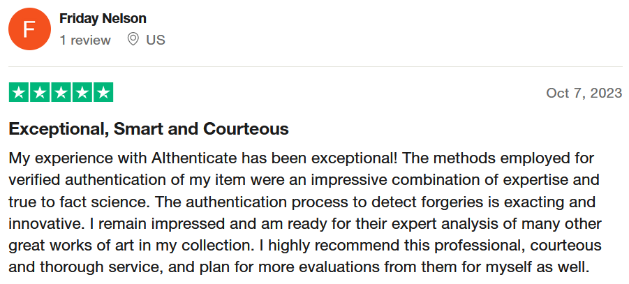 Four easy steps to get your item verified or appraised: 1) Take pictures of the item (front and back): 2) Write your e-mail address: 3) Describe the item and provenance (optional): 4) Select your report needs: Value Only ($59): Expert valuation report. Basic Report ($99): Authentication and valuation. Complete Report ($299) (Limited time offer: $199): The Complete Report includes a full analysis of Authenticity, a detailed Valuation, restoration tips, and our exclusive marketing tips. Read our latest reports in our main page.